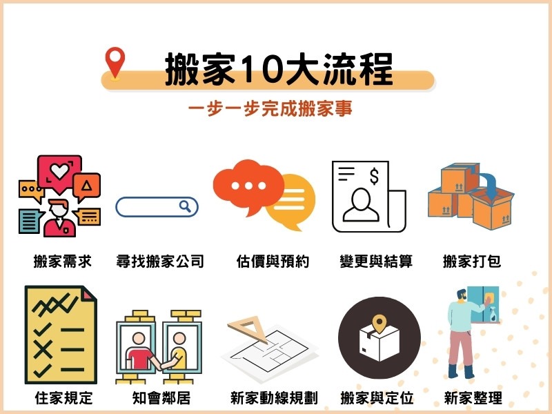 搬家前、中、後有哪些注意事項?身為搬家新手,只知道要整理、打包家中物品,根本不知道還有哪些事情要留意,而長輩不斷耳提面命必須注意搬家習俗與禁忌,各種資訊與待辦事項從四面八方而來,著實無所適從。本篇文章彙整搬家10大流程與8大注意事項、搬家4大習俗禁忌,看完文章跟著照做準沒錯。